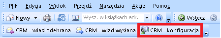 Po uruchomieniu programu MS Outlook należy kliknąć przycisk CRM-Konfiguracja, który będzie widoczny po przejściu do zakładki Dodatki (Outlook 2010-2013) lub od razu w osobnym pasku (Outlook 2003-2007).
