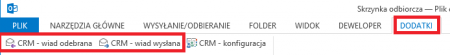 W celu zaimportowania wiadomości do systemu CRM należy zaznaczyć wybraną wiadomość oraz kliknąć jeden z przycisków widocznych w zakładce Dodatki (Outlook 2010-2013) lub na pasku narzędzi(Outlook 2003-2007):